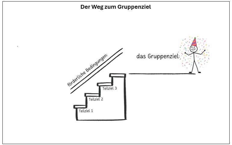 Das Rahmenziel fungiert als das Dach und das Gruppenziel muss unter dieses Dach passen. Teilziele helfen den Gruppenmitgliedern auf dem Weg zur Erreichung ihres Gruppenziels. Als Gruppenleitung kommt Dir die Aufgabe zu, die Gruppenmitglieder darin zu unterstützen, ihr Gruppenziel zu identifizieren. Dieses sollte eine möglichst große Übereinstimmung mit den persönlichen Zielen der Gruppenmitglieder aufweisen. Außerdem hast Du als Gruppenleitung die Aufgabe, mit den Gruppenmitgliedern zusammen Teilziele zu identifizieren, mit denen sie ihrem Gruppenziel näherkommen. Die Gruppenleitung hat im Prozess die kontinuierliche Aufgabe, förderliche Bedingungen für die Zielerreichung (Teilziele, Gruppenziel, Rahmenziel) zu schaffen.